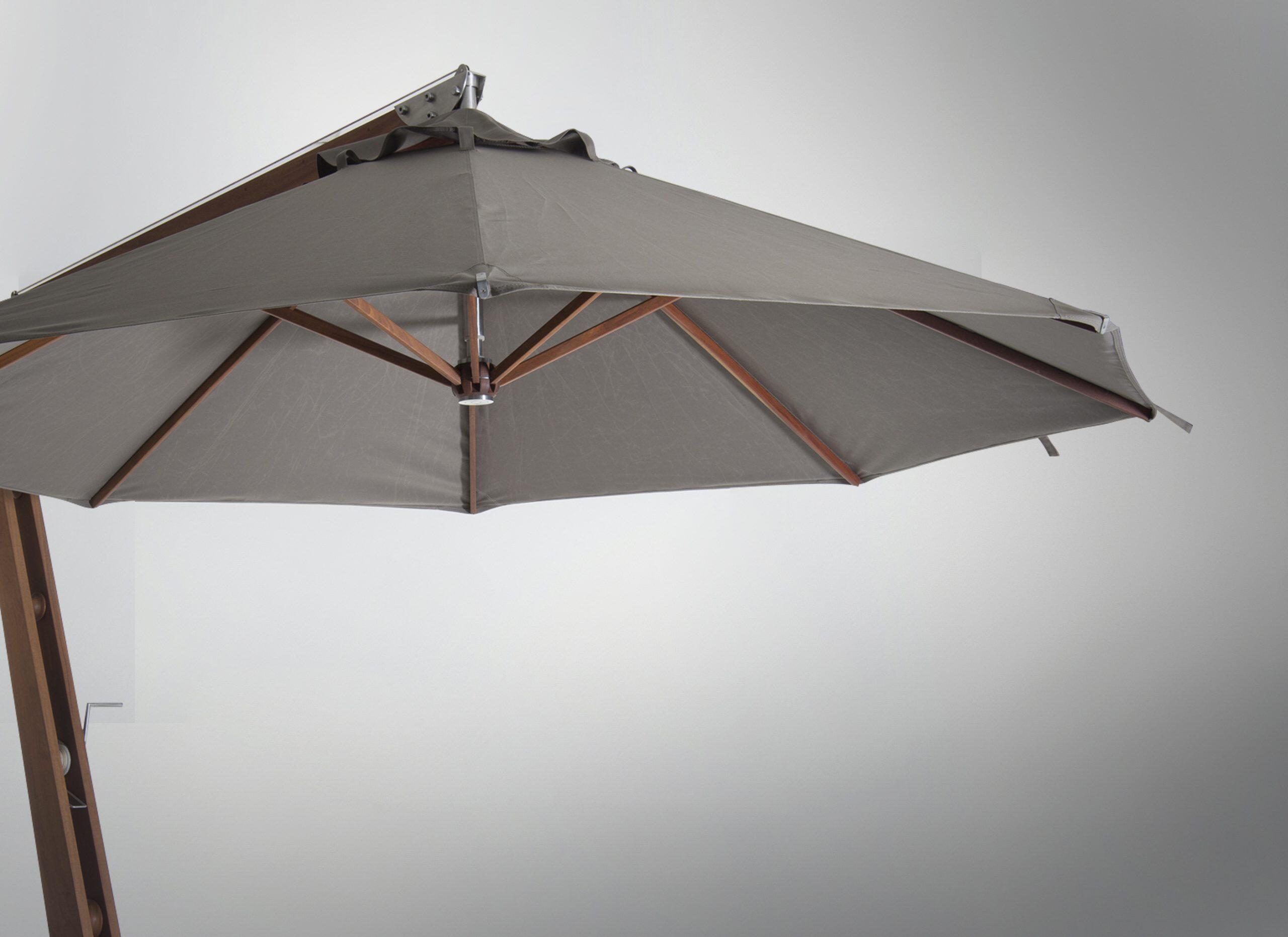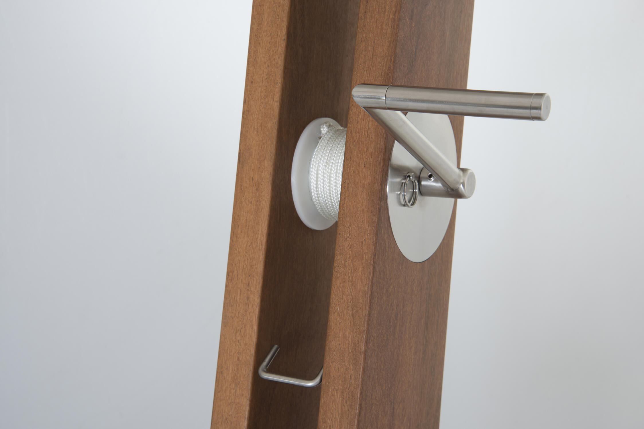 Estructura: Madera dura. Uniones: Acero inoxidable AISI 304 satinado. Cubierta: Lona gruesa 100% acríica, teñida en masa, hidrorepelente y con protección UV (desforrable). Base: Plancha de acero inoxidable AISI 304 con interior de metal pesado. Sistema de abertura con manivela.