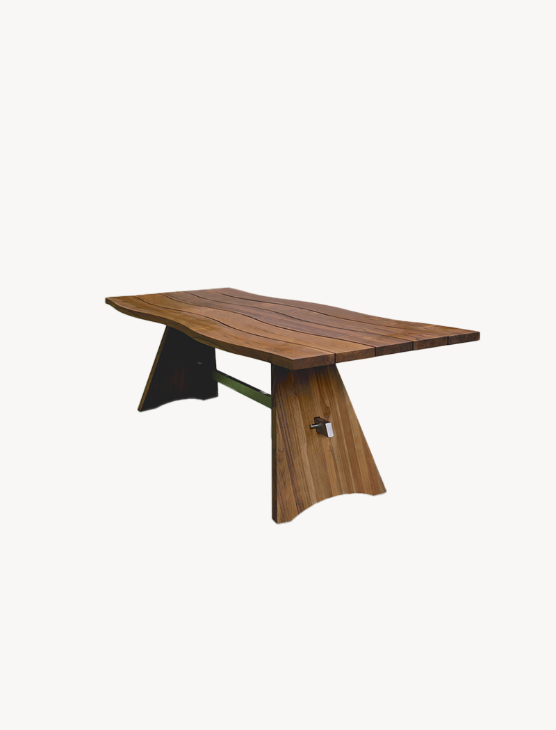 Tablero: Madera teca reforestada. Base desmontable: Madera teca reforestada con travesaño en acero inoxidable AISI 304 satinado.